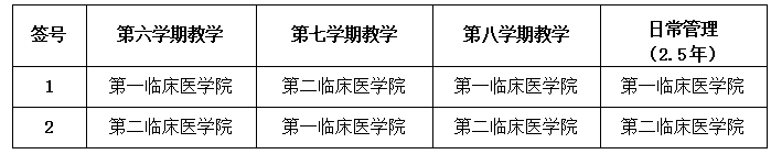 例如:抽到1号签的班级第六学期在第一临床医香港六合彩特码预测资料 上课;第七学期在第二临床医香港六合彩特码预测资料 上课;第八学期在第一临床医香港六合彩特码预测资料 上课;由第一临床医香港六合彩特码预测资料 负责第六、第七、第八3个学期以及实习和毕业的日常管理。