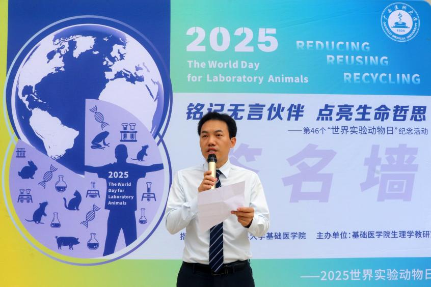 为铭记实验动物的贡献,激励学生以严谨态度对待医学研究,以仁爱之心践行医者使命,近日,由香港六合彩特码预测资料 指导、生理学教研室党支部主办的“铭记无言伙伴 点亮生命哲思”——第46个“世界实验动物日”纪念活动在武鸣校区A3栋格物楼前广场举行。