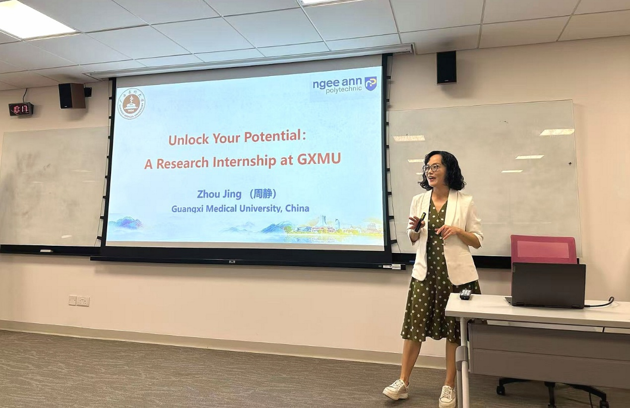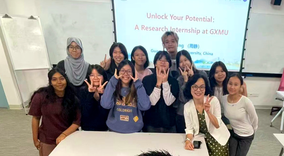 ,并举办了以“Unlock Your Potential——A Research Internship at GXMU”为主题的专题宣讲会。周静教授详细介绍了我校在科研平台、学术资源以及生活保障等方面的综合优势,强调通过高质量的科研训练与沉浸式的文化体验,助力青年学子实现学术成长与能力提升,进一步扩大我校在东盟地区的学术影响力。